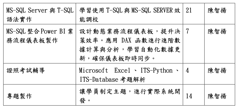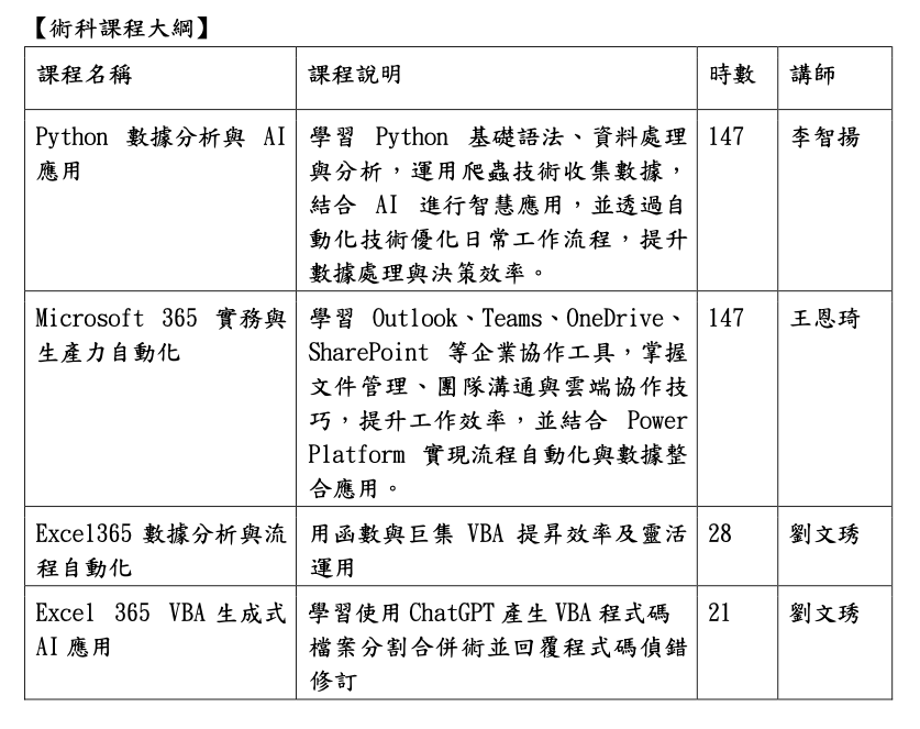 6. 熟悉資料庫管理與 SQL 操作:學會資料查詢、表單設計、JOIN 操作等技術,提升資料處理與分析能力與 Power BI 結合業務流程整合應用。 7. 探索 AI 與生成式 AI 的應用:理解 ChatGPT 及生成式 AI 在文件處理、數據分析、圖片生成等領域的應用,學習如何將 AI 技術整合至日常 工作與商業決策中。